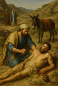 Jesus erzählt das Gleichnis vom barmherzigen Samariter. Ein Mann wird überfallen, ausgeplündert und schwer verletzt. Zwei religiöse Würdenträger – ein Priester und ein Levit – sehen ihn und gehen vorbei. Erst ein Samariter, ein Außenseiter, bleibt stehen. Er hilft, pflegt, bezahlt. Jesus fragt: „Wer von den dreien war der Nächste?“ Die Antwort: „Der, der Barmherzigkeit zeigte.“ Und Jesus sagt: „Dann geh und handle du genauso!“