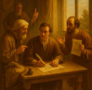 Die zweite Szene wirkt wie ein orientalisches Büro. Bücher, Schriftrollen, Öllampen. In der Mitte sitzt der Verwalter – ein junger Mann mit nachdenklichem Blick. In der Hand hält er zwei Schuldscheine. Einer trägt noch die Zahl „100“ – der andere ist bereits überschrieben: „50“.
