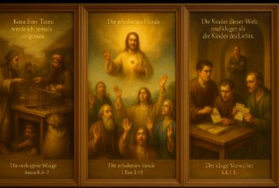 Stellt euch einen großen, leuchtenden Triptychon-Altar vor – ein dreiflügeliges Gemälde, das im Licht des Morgens aufstrahlt. Drei Szenen sind zu sehen, jede ist ein eigenes Fenster zur Wahrheit – und doch erzählen sie zusammen eine einzige Geschichte: Gottes Sehnsucht nach Gerechtigkeit, Weisheit und Gebet.